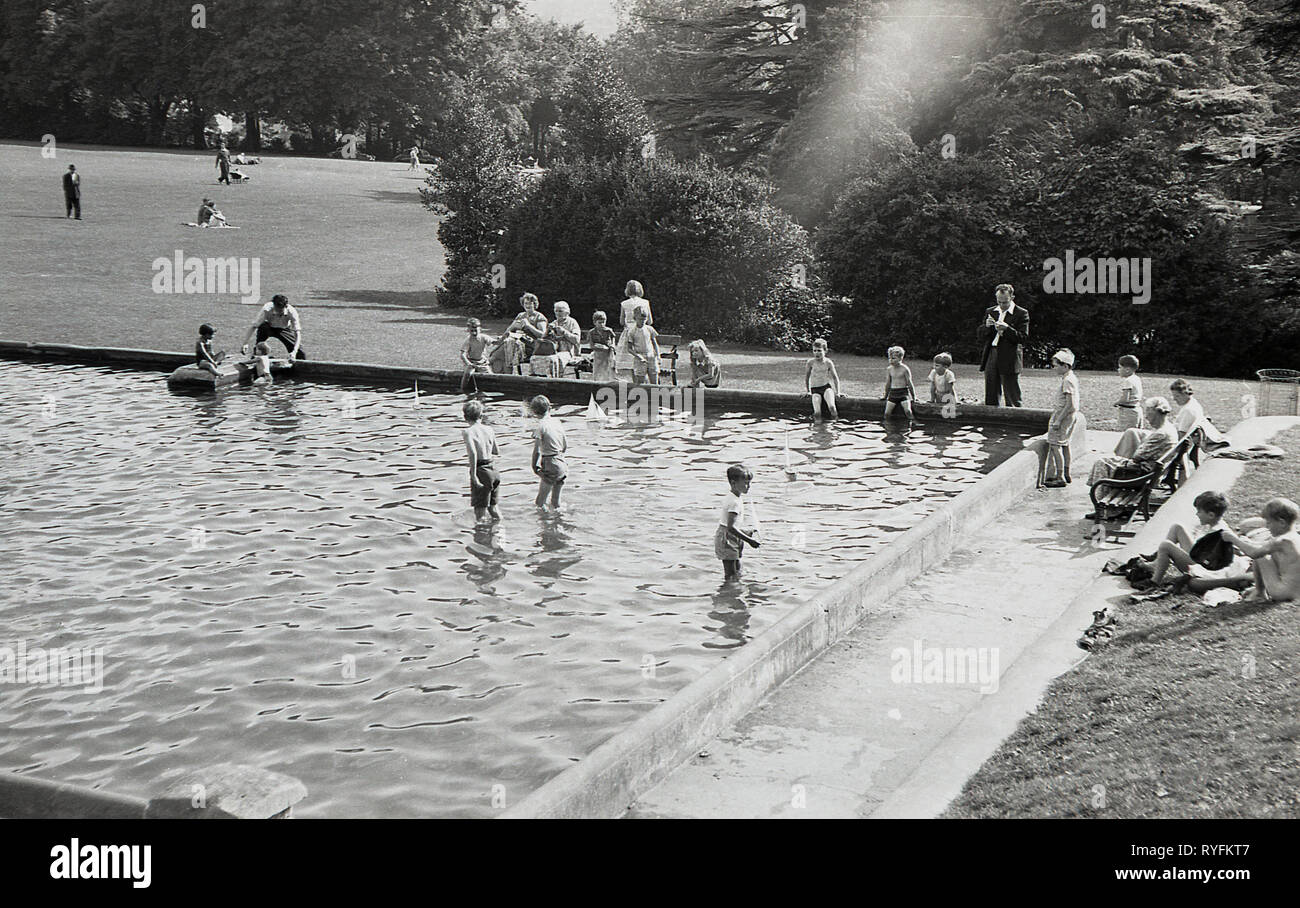 1950s Historical Children And Parents At An Outdoor Paddling Pool Or Boating Lake In A Park England Uk Stock Photo Alamy